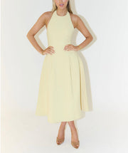 If elegance could take the form of a dress, she’d embody it effortlessly. Our beloved dropped hem design returns now in a midi length and a vibrant lemon shade that brings a timeless pop of color to your summer style. Featuring a refined halterneck, two delicate darts for that signature Zahrà silhouette, and a gracefully curved open back, all tied together by our iconic drop waist.