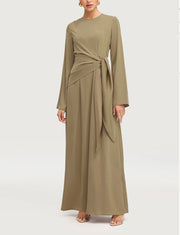 Experience effortless luxury in our Side Tie Dress in Desert Palm Green. Designed with a flowy silhouette, flared sleeves, and an adjustable side-tie front, this piece captures timeless elegance. Make a statement with every step in this refined and exclusive design.